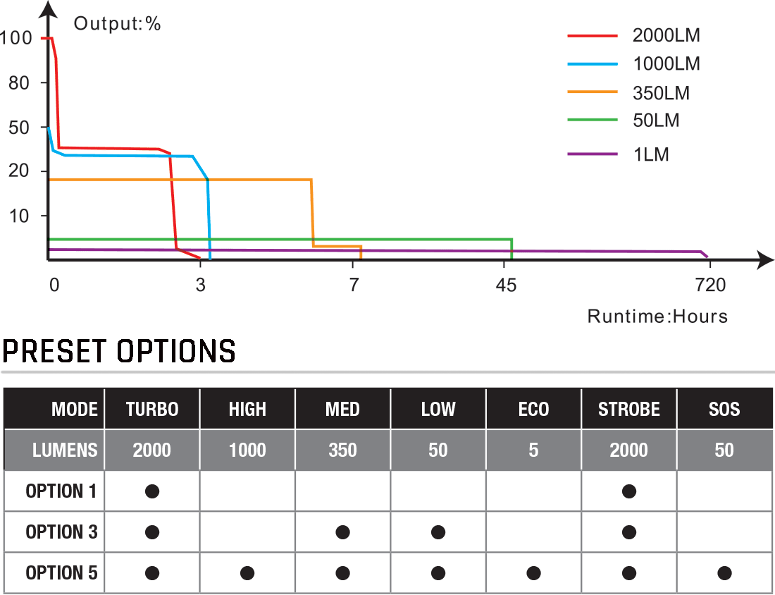 - The output amounts for each lighting option do not include Strobe and SOS.
