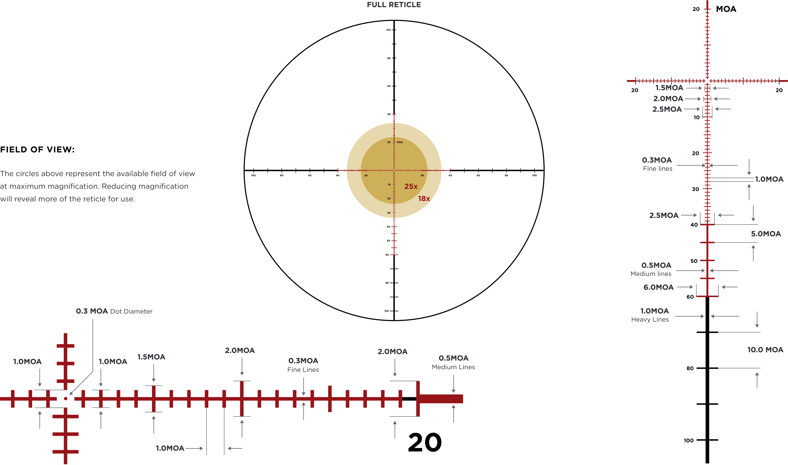 These low-profile dials are available on select models and provide up to 71.5MOA of adjustment in 3 revolutions and 1/4 MOA clicks. Visual and tactile revolution indicators ensure you don’t get lost in the travel. The ZeroLock® feature prevents inadvertent adjustments and ensures accurate return to zero. - First Focal Plane