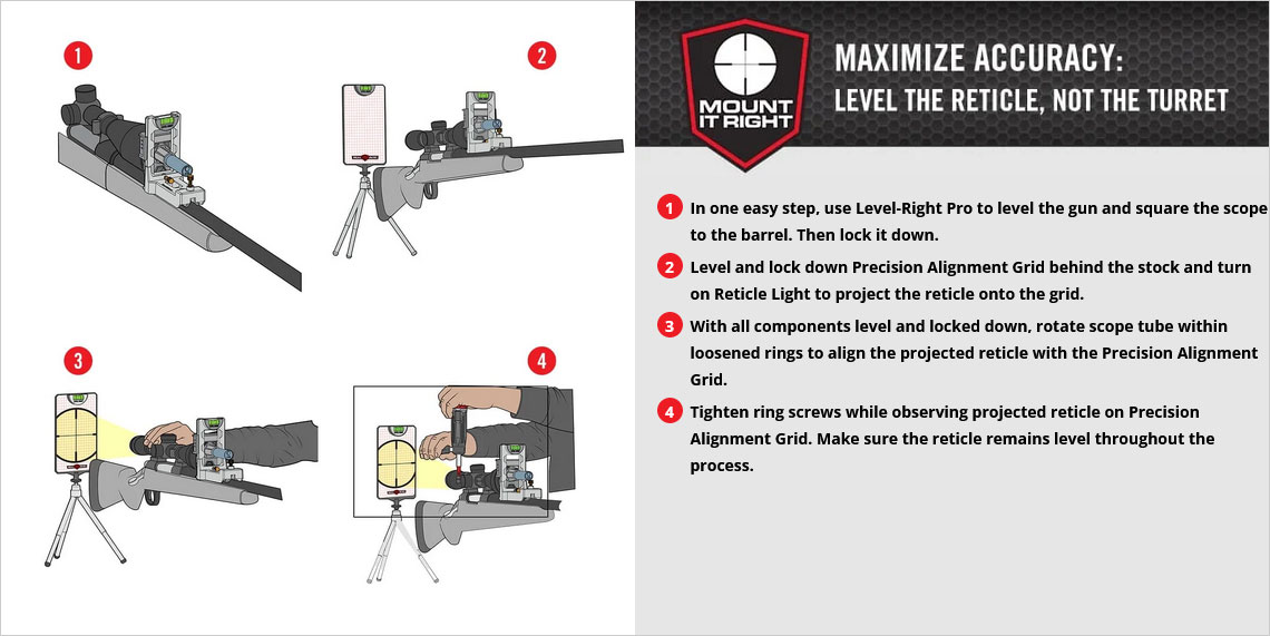 A level reticle is critical to long range Accuracy. For longer shots a canted (or unlevel) reticle will pull or push the bullets trajectory off of vertical center. It gets worse the further the distance increases. A level scope means that the reticle (crosshairs) will be perfectly aligned with the rifle bore. Balancing small levels on a scope turret and gun receivers has been a commonly accepted practice for years. Not only is this a clumsy process, it’s wrong. The turret on most scopes is not perfectly aligned with the reticle (crosshairs), so even if your turret is level to the gun, your scope may not be. Level Right Pro changes all that by simplifying scope alignment in 4 easy steps. Accurate and intuitive, this time saving instrument quickly aligns the actual scope reticle to the horizontal gun plane (regardless of turret alignment), which is key to the long-range accuracy of your rifle. Level-Right Pro helps you quickly and confidently mount a scope for maximum accuracy.