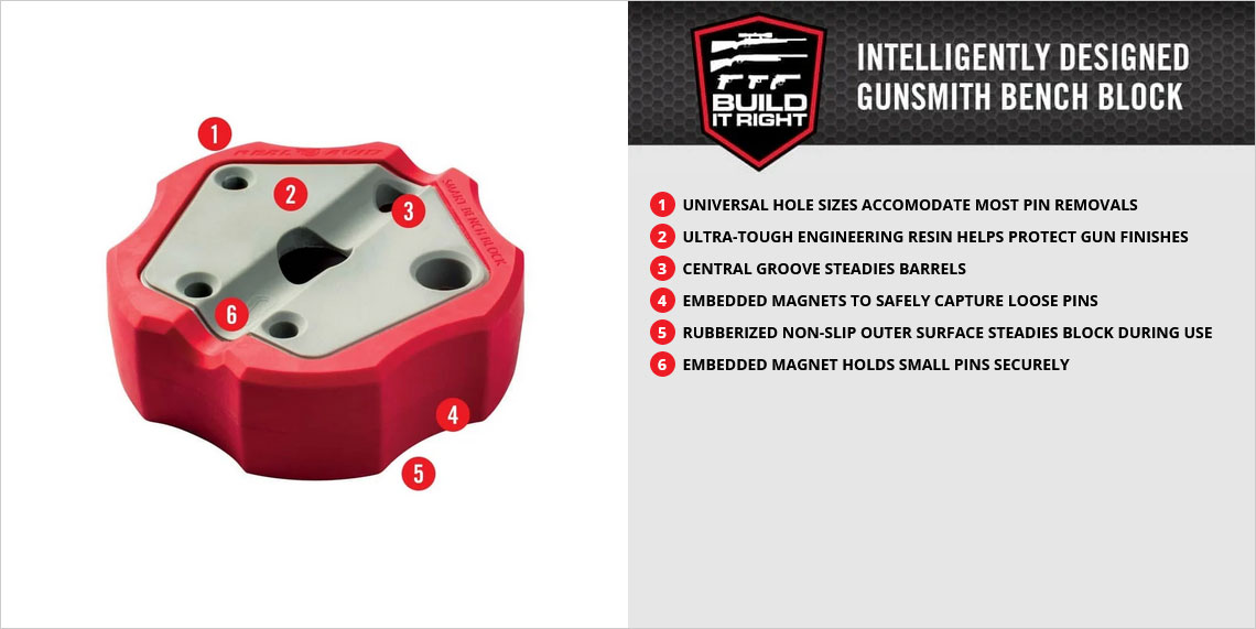 Made from engineering grade resin, this intelligently designed gunsmith block helps protect gun finishes. The non-slip outer ring keeps the block from sliding on tables or benches while driving pins. An embedded magnet captures and holds driven pins so that they won’t roll away. A rounded slot seats barrels and gun slides for increased stability. Designed to work with most guns. Makes the job easier and faster! Made from engineering-grade resin, this block helps protect gun finishes. The outside rubber liner keeps the block from sliding on any surface when driving pins. And inside the block is a magnet that grabs dropped pins. So intelligently designed, you’ll feel smarter just using it.