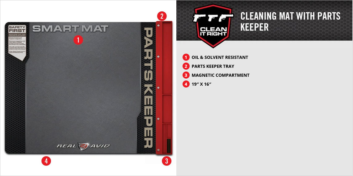 The Handgun Smart Mat offers you a cleaning surface that is large enough to handle a fully disassembled handgun. An oil-resistant surface keeps countertops and kitchen tables protected from chemicals and CLP. The attached parts tray ensures your pins, bolts and springs are never lost again. Give your handgun the respect that it deserves.