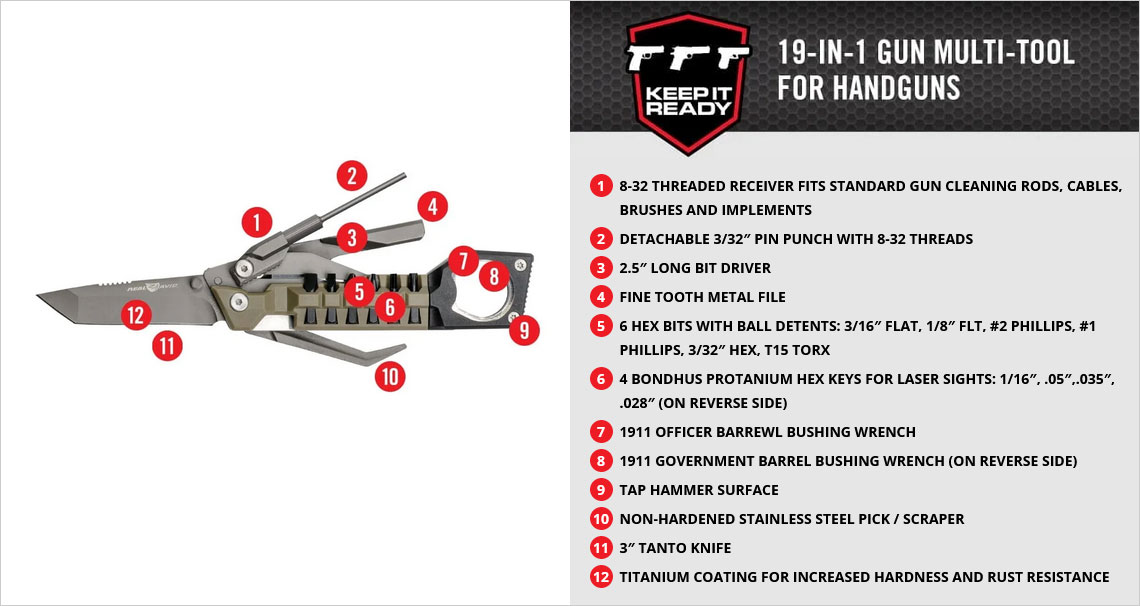 When it comes to mission-specific tools the new Pistol Tool is packed with functionality. Eighteen highly-capable titanium coated tools in a tactical, rugged frame work with ease and precision to keep handguns firing reliably and accurately.