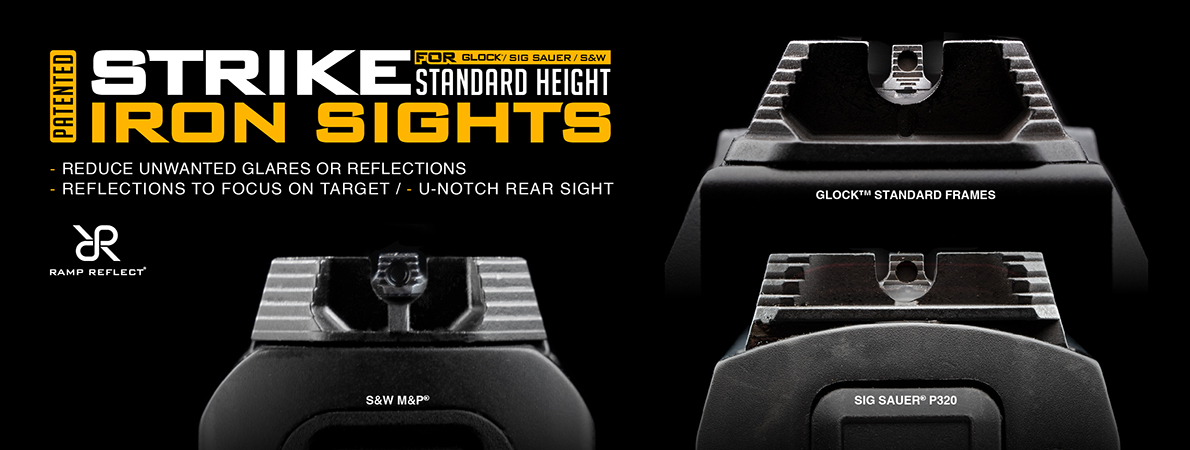 The Strike Iron Sights (Standard Height) give you the best affordable option so you can throw away those plastic (GLOCK™) or boring OEM steel sights. Designed to help with proper sight alignment and keep the shooter's eyes focused, there is natural light that is seen on both sides of the front sight between the u-notch rear sight. Steps placed in the rear of both sights help angle and reduce unwanted glares or reflections out of your eyes. Lines and angles designed to use natural light reflections and shadow play to keep user's eye aligned and focused on the target. The rear sight is designed with a negative angle so that the shooter will see the back wall as dark as possible to give total focus on the sights. The line running down the middle of the rear sight is there to catch light from above and create a "line" illusion in which the shooter can use it to assist in aiming. The front sight can be painted to user’s color preference or use glow-in-the-dark paint to customize the look and use of the sights. Made from SUS630 hardened stainless steel, the Strike Iron Sights (Standard Height) is engineered to be as robust as possible while giving you one of the most budget friendly options on the market.